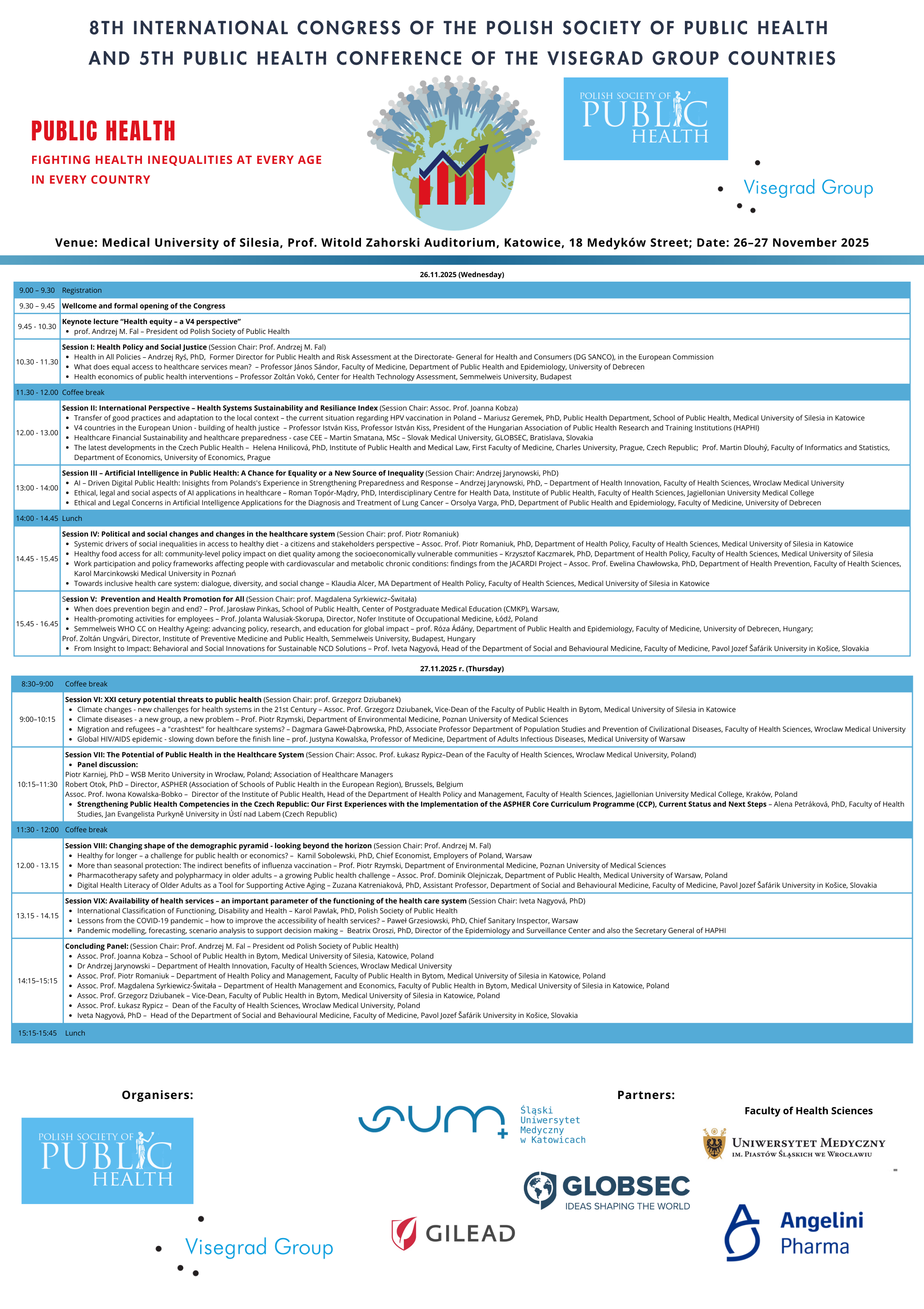 Program obejmuje najważniejsze wyzwania współczesnych systemów ochrony zdrowia – od sprawiedliwości społecznej, przez sztuczną inteligencję, po globalne zagrożenia XXI wieku. Dyskusje i sesje tematyczne pozwolą spojrzeć na zdrowie z perspektywy lokalnej i międzynarodowej, łącząc naukę z praktyką. To wyjątkowa okazja, by wspólnie poszukiwać rozwiązań na rzecz bardziej sprawiedliwego i odpornego systemu ochrony zdrowia.